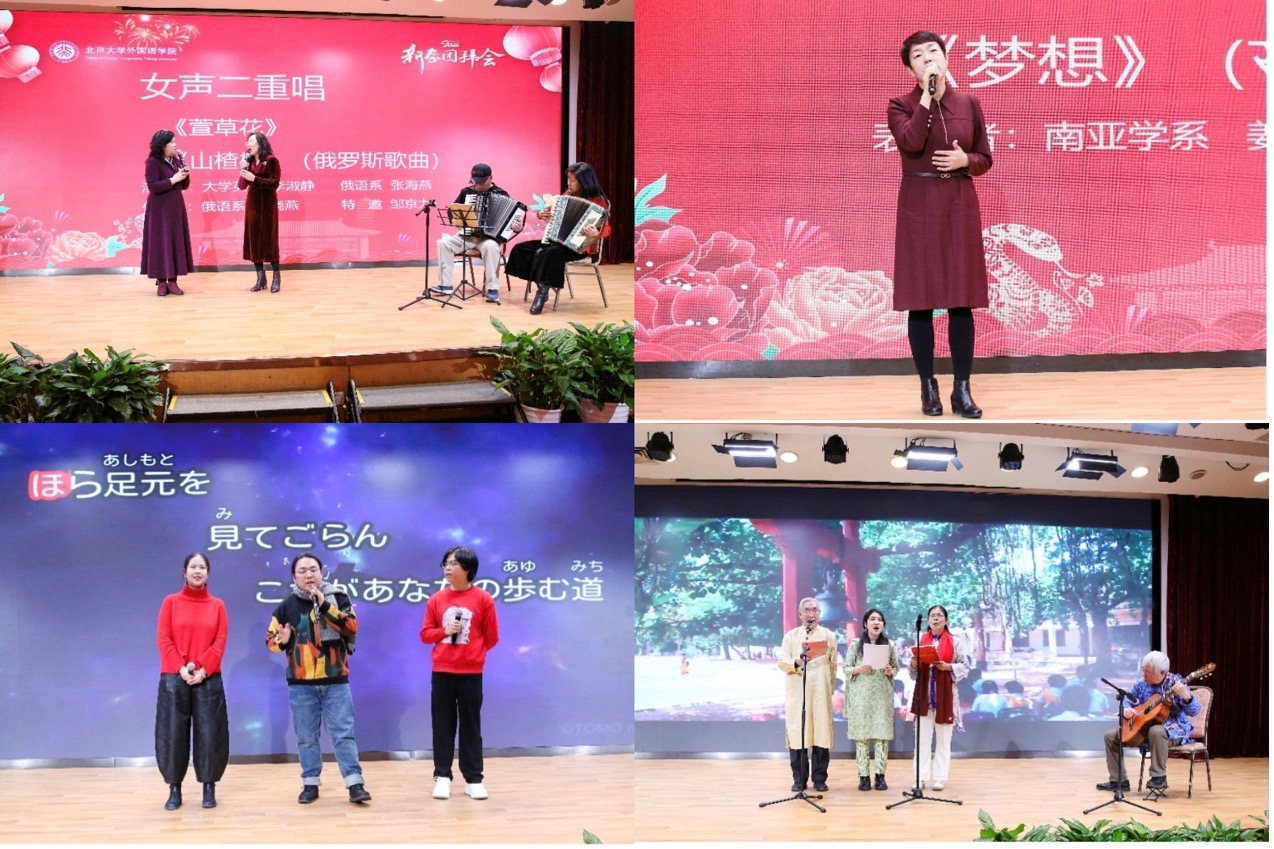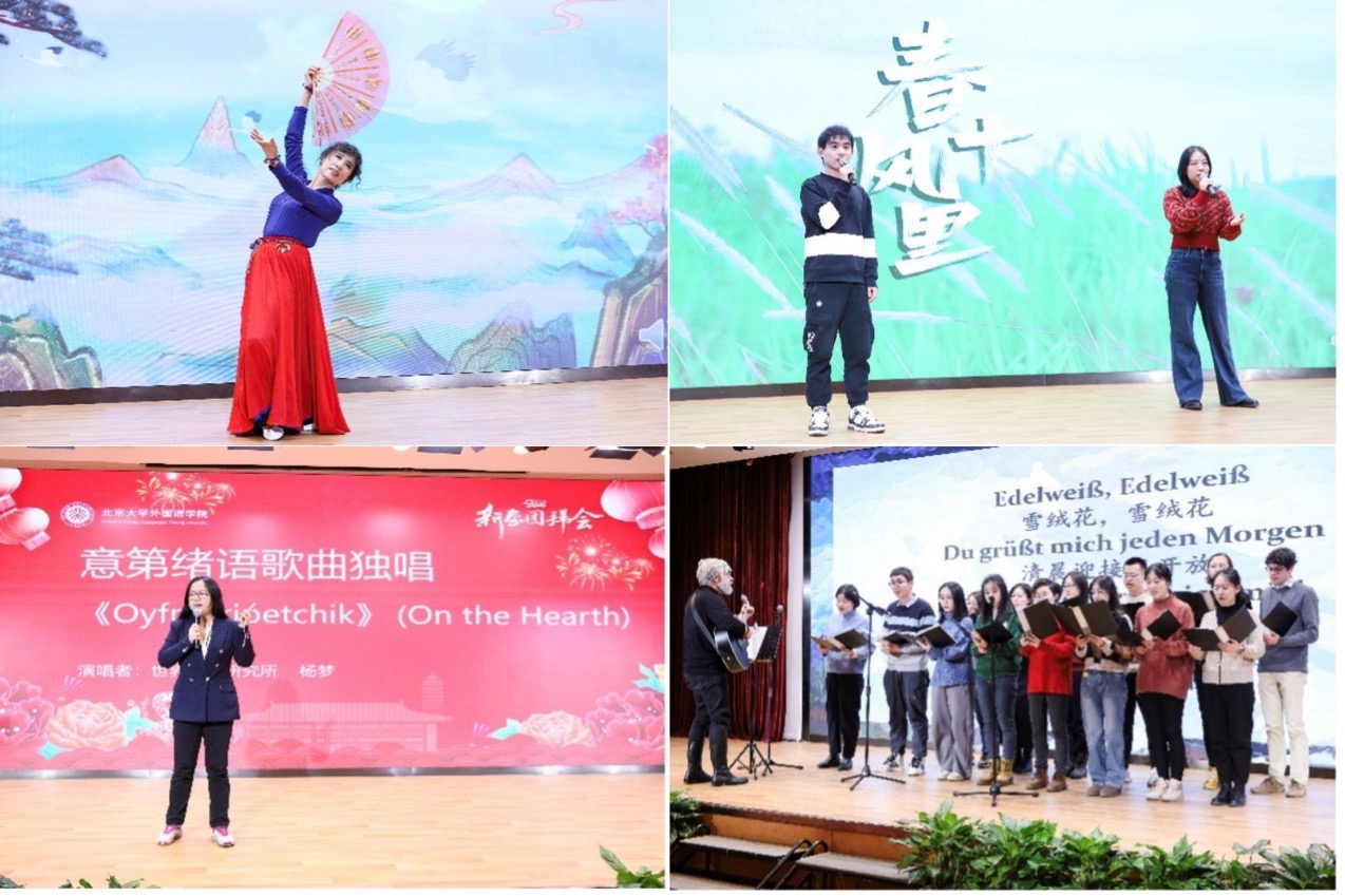 团拜会的文艺表演与互动环节同样是好戏连台、精彩不断。大学英语的李淑静老师与俄语系的张海燕老师携手带来女声二重唱,伴随着俄语系教授查晓燕和特邀嘉宾邹京力老师悠扬的手风琴声,《萱草花》与《山楂树》的悠扬歌声如春日微风,轻柔拂面。南亚学系的姜永红老师带来印地语歌曲《梦想》独唱,用醇厚嗓音诠释着对梦想的执着追求。日语系的徐一然、虞雪健、曾堰杰三位老师合唱日语歌曲《向着未来》,他们青春洋溢的歌声仿佛带着蓬勃朝气,向着新一年高歌猛进。《泰戈尔导读》课程的师生们带来泰戈尔歌曲联唱,《往事依依》、《异国女郎》、《我带着强烈的愿望而来》等经典曲目一一唱响,他们用美妙歌声串起泰戈尔笔下的诗意世界。朝韩语系张敏老师的独舞《朝鲜扇舞》惊艳亮相,她手持彩扇,翩翩起舞,轻盈的步伐、灵动的扇花,将朝鲜民族舞蹈的独特韵味展现得淋漓尽致。语言所的郑萱、李臻老师献上二重唱《春风十里》,她们温柔的嗓音恰似春日暖阳,温暖了观众的内心。世文所杨梦老师带来意第绪语歌曲《Oyfn Pripetchik》独唱,为大家带来了独特的体验。德语系师生在外教的吉他伴奏下带来德语歌曲联唱《雪绒花》、《乘着歌声的翅膀》,熟悉的旋律引发了观众的共鸣,台下的观众们情不自禁加入了合唱。