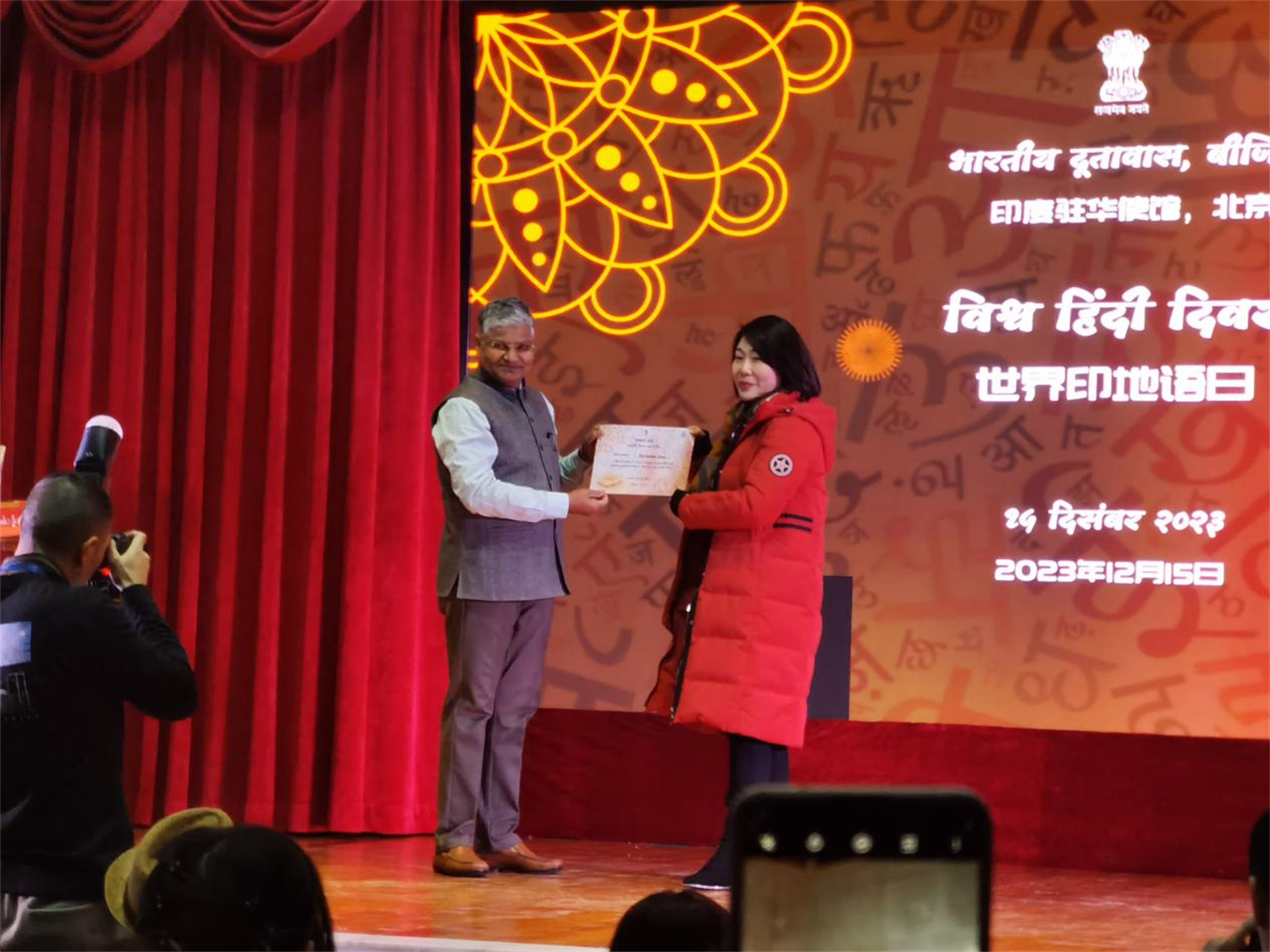 庆祝活动在印度驻华大使罗国栋(Pradeep Kumar Rawat)先生及学界前辈的致辞中拉开帷幕。庆祝活动包括“印地语诗歌朗诵比赛”和“印地语节目展演”等环节,来自北京大学、清华大学、北京外国语大学、中国传媒大学、北京第二开云体育等高校师生和中国国际广播电台国际在线印地语部记者以及在京印度留学生参加该庆祝活动。我院南亚学系印地语专业师生在活动中表现优异,取得佳绩:2021级印地语专业本科生李依诺在“印地语诗歌朗诵比赛”中获最佳表现奖,2021级和2023级印地语本科生的积极展演获得赞誉,我院印地语专业喜获“优秀组织奖”,印地语专业教师代表王靖、贾岩获“优秀指导奖”。