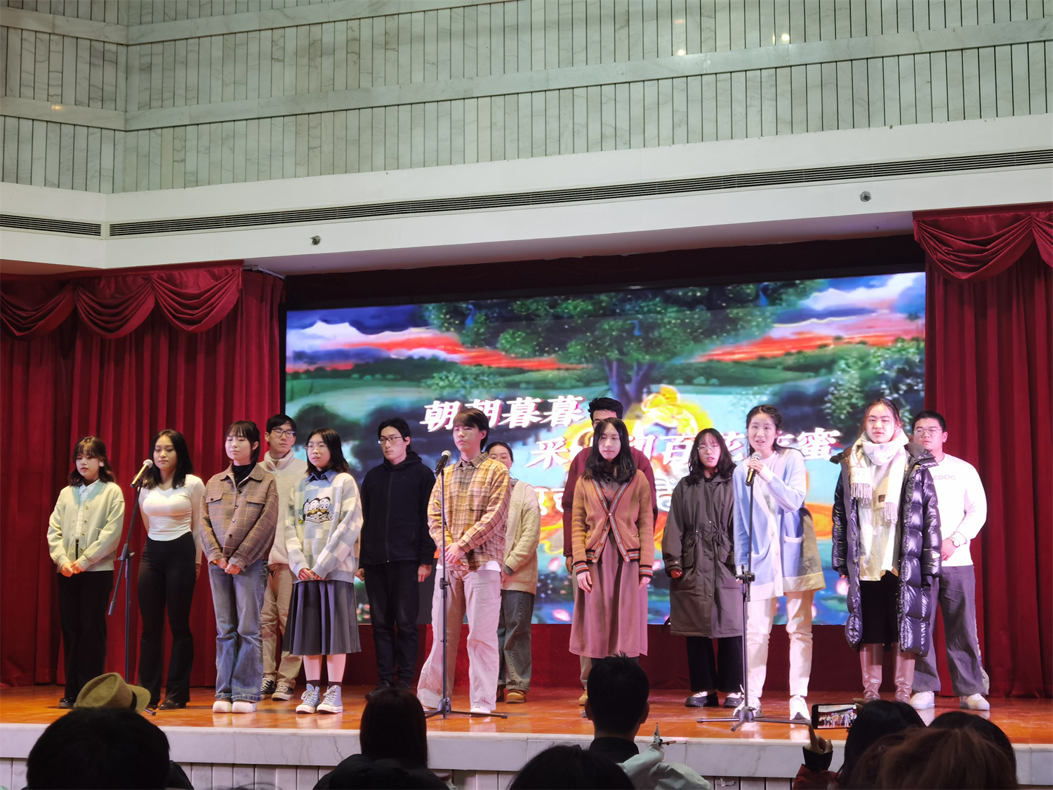 我院2023级印地语专业全体本科生为大家演唱了印度流行歌曲《惟有你》( Tum Hi Ho ),并配以学生翻译和自制的中印双语字幕视频,展示了我院学子对印地语的学习成果及对中印文化交流的独到见解。观众们沉浸在同学们悠扬的歌声中,如痴如醉。