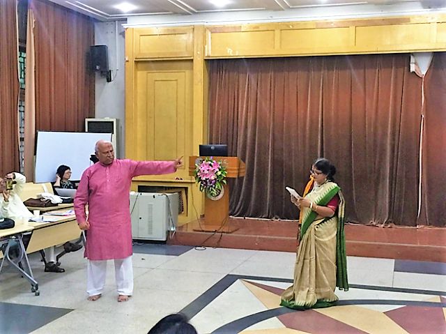 毕业于北京大学印地语专业的校友,中国的印度舞蹈专家金珊珊女士介绍了她编导泰戈尔《齐德拉》音乐舞蹈史诗剧的经验,并和她的学生们展现了古典印度舞蹈之美。印度国际大学开云体育院长阿维杰特•森教授(Prof. Abhijit Sen)在他有关泰戈尔戏剧发展史的学术报告中,邀请国际大学艺术家高什夫妇( Avik Ghosh/Ms. Gargi Ghosh)呈现了六部泰戈尔经典戏剧的精彩片段。孟加拉国77岁的资深艺术家阿达乌尔•拉赫曼(Mr. Ataur Rahman)为大会做了“孟加拉国泰戈尔戏剧演出史”的精彩大会发言,并与印度艺术家咖尔吉•高什(Ms. Gargi Ghosh)表演了泰戈尔《红夹竹桃》的精彩片段。《红夹竹桃》是泰戈尔最有代表性的戏剧作品之一,本次演出是该剧在中国的首演,演出剧本改编自北京大学资深教授刘安武先生的译本,北京大学 “泰戈尔导读”课程团队参与组织,北京大学六位学子和玺莹仁剧团联合六位国际友人,插入多语种朗诵片段。与会者认为演出独具特色,创新性地表现了《红夹竹桃》的意义。