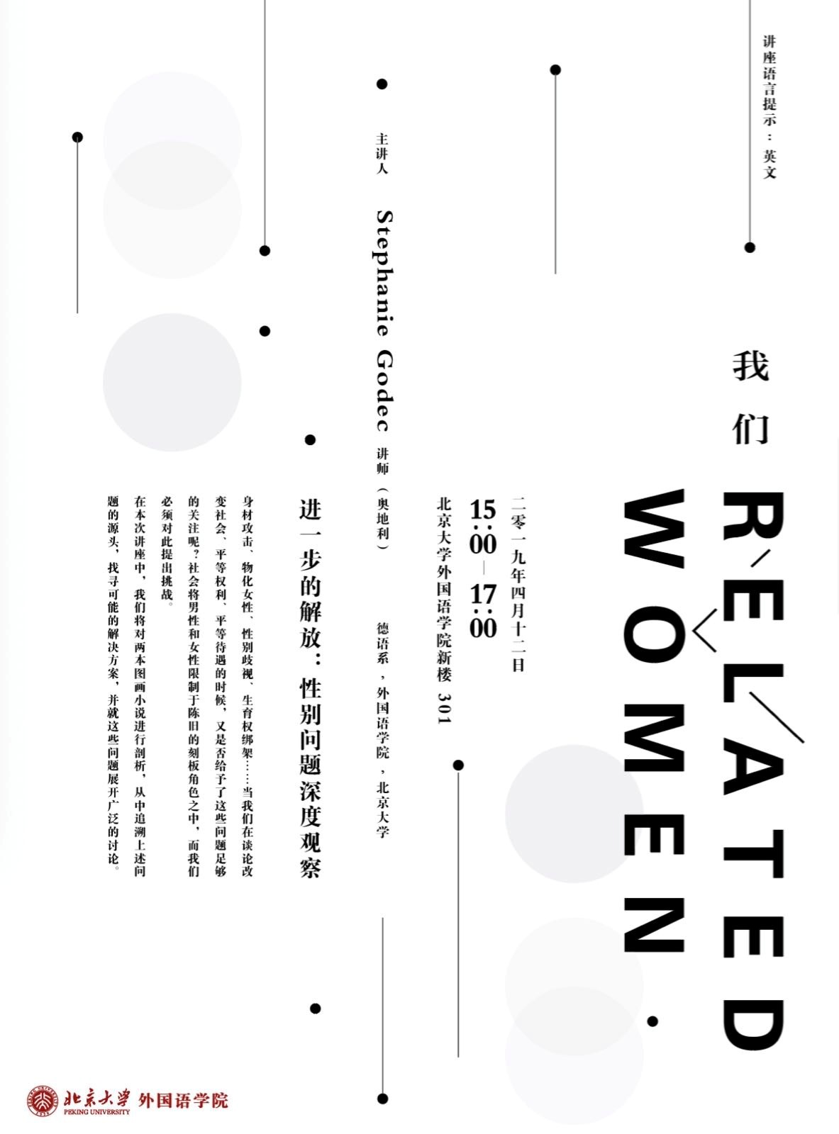 “我们-Wǒmen-Related”专题系列讲座由开云体育德语系外籍讲师Stephanie Godec发起和策划,从女性视角出发,关注不同群体中、不同角度下的女性问题。本系列讲座规划开展三场讲座及一场主题讨论活动。2019年4月12日下午,系列第一讲在外院新楼301会议室举行,本场讲座主题为《进一步的解放:性别问题深度观察》,由发起人Stephanie Godec主讲。