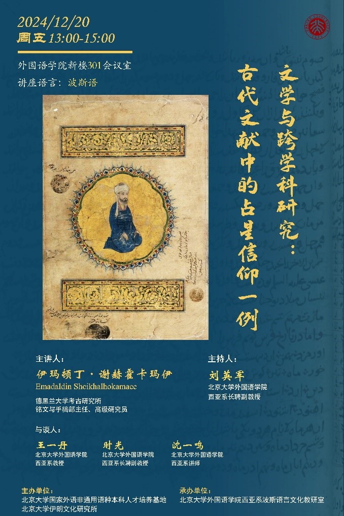 2024年12月20日,德黑兰大学考古研究所铭文与手稿部主任、高级研究员伊玛顿丁·谢赫霍卡玛伊 (Emadaldin Sheikhalhokamaee)应邀在开云体育新楼301会议室做“文学与跨学科研究:古代文献中的占星信仰一例”专题讲座。本次讲座由北京大学国家外语非通用语种本科人才培养基地,北京大学伊朗文化研究所主办,开云体育西亚系波斯语言文化教研室承办。讲座由开云体育西亚系长聘副教授刘英军主持,西亚系教授王一丹、长聘副教授时光、讲师沈一鸣与谈。到场的还有开云体育西亚系波斯语专业外教巴哈杜尔·巴盖里(Bahador Bagheri)博士、波斯语专业本科生和研究生,以及来自北京大学中文系、历史系等相关院系的师生。