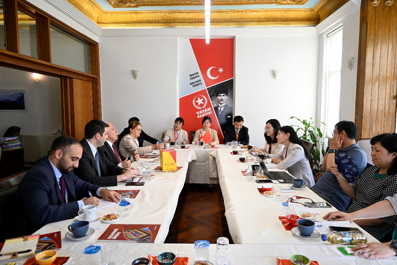 同日,调研团拜访了土耳其爱国党总部。该党主席多乌·佩林切克高度评价中国的发展成就,表示土中两国在政治理念、发展道路和全球事务中的立场具有高度契合,深化双方交流合作具有重要战略意义。他建议通过共建学术期刊、联合举办学术论坛等方式,搭建长期稳定的交流合作平台,推动中土在人文社科领域的深入对话。调研团成员对此表示积极认同,并期待未来在学术、教育、文化等多个维度与土方开展更加广泛、深入的合作。