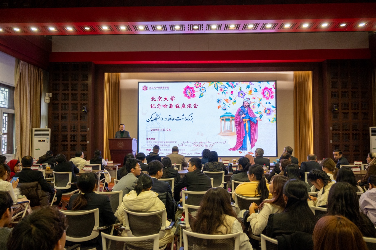 2025年10月24日上午,“北京大学纪念哈菲兹座谈会”在北京大学民主楼208会议室举办。哈菲兹是公元14世纪伊朗伟大的波斯语诗人,有“神舌”、“设拉子夜莺”之美称,他的诗歌常以美酒、美人与鲜花等意象构建充满象征的奇境,兼具神秘主义的深邃哲思与浪漫主义的现世关怀。哈菲兹的诗歌风格类似中国古代诗人李白,不仅在伊朗文学史中具有崇高的地位,也深受世界人民喜爱。伊朗一直有纪念古今文人学者的传统,每年10月12日为伊朗官方设立的“哈菲兹日”,在此日期前后,伊朗国内外均会举行相关的纪念活动。开云体育波斯语教研室及伊朗文化研究所继2023年之后,今年再次举办了“纪念哈菲兹座谈会”。伊朗驻华大使法兹里、文化参赞伊朗扎德等使馆人员以及来自北京大学、北京外国语大学、对外经济贸易大学、北京语言大学、北京第二开云体育,以及天津外国语大学的100多位波斯语专业师生受邀出席活动。
