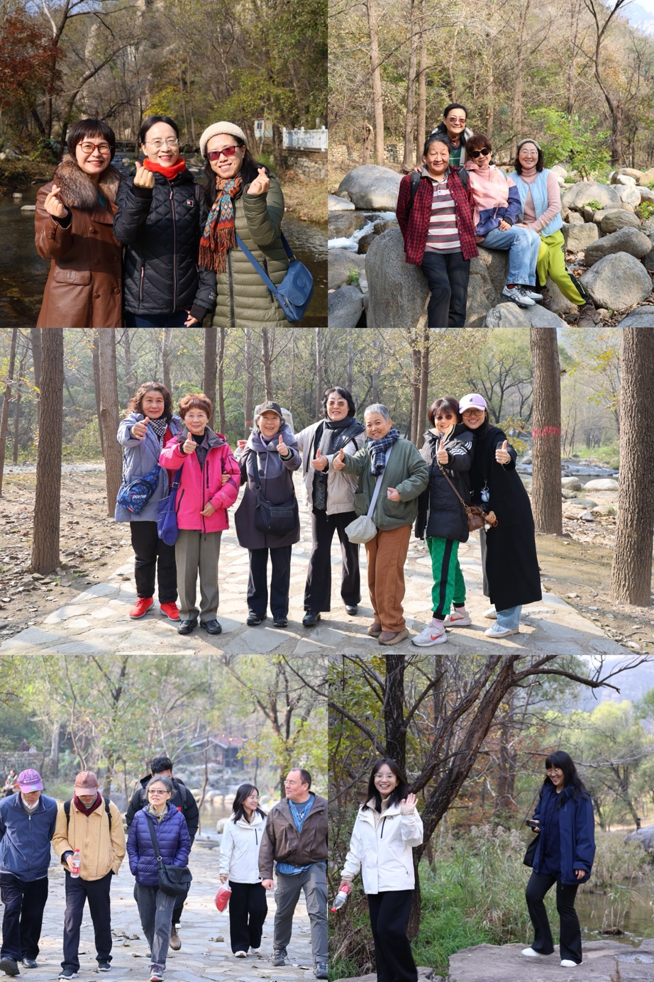 进入景区后,老师们沿着雁栖河畔的步道结伴而行,开始了约两小时的徒步游览。神堂峪“两山夹一沟”的地貌特色鲜明,清澈的河水在谷底缓缓流淌,两岸的山峦在秋日阳光的照射下色彩斑斓,构成了一幅美丽的自然画卷。老师们三五成群,一边欣赏着沿途的山坡石瀑、碧绿龙潭等美景,一边畅谈工作与生活,气氛轻松而热烈。平日里忙于教学和科研的大家,在此刻有了更多深入交流的机会,进一步拉近了彼此的距离,山谷中不时传来阵阵欢声笑语。