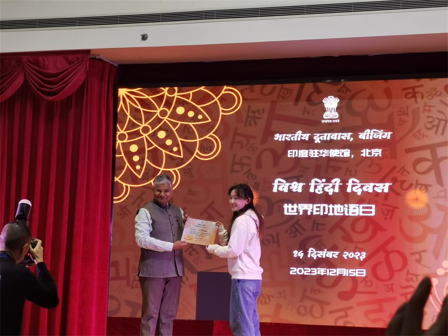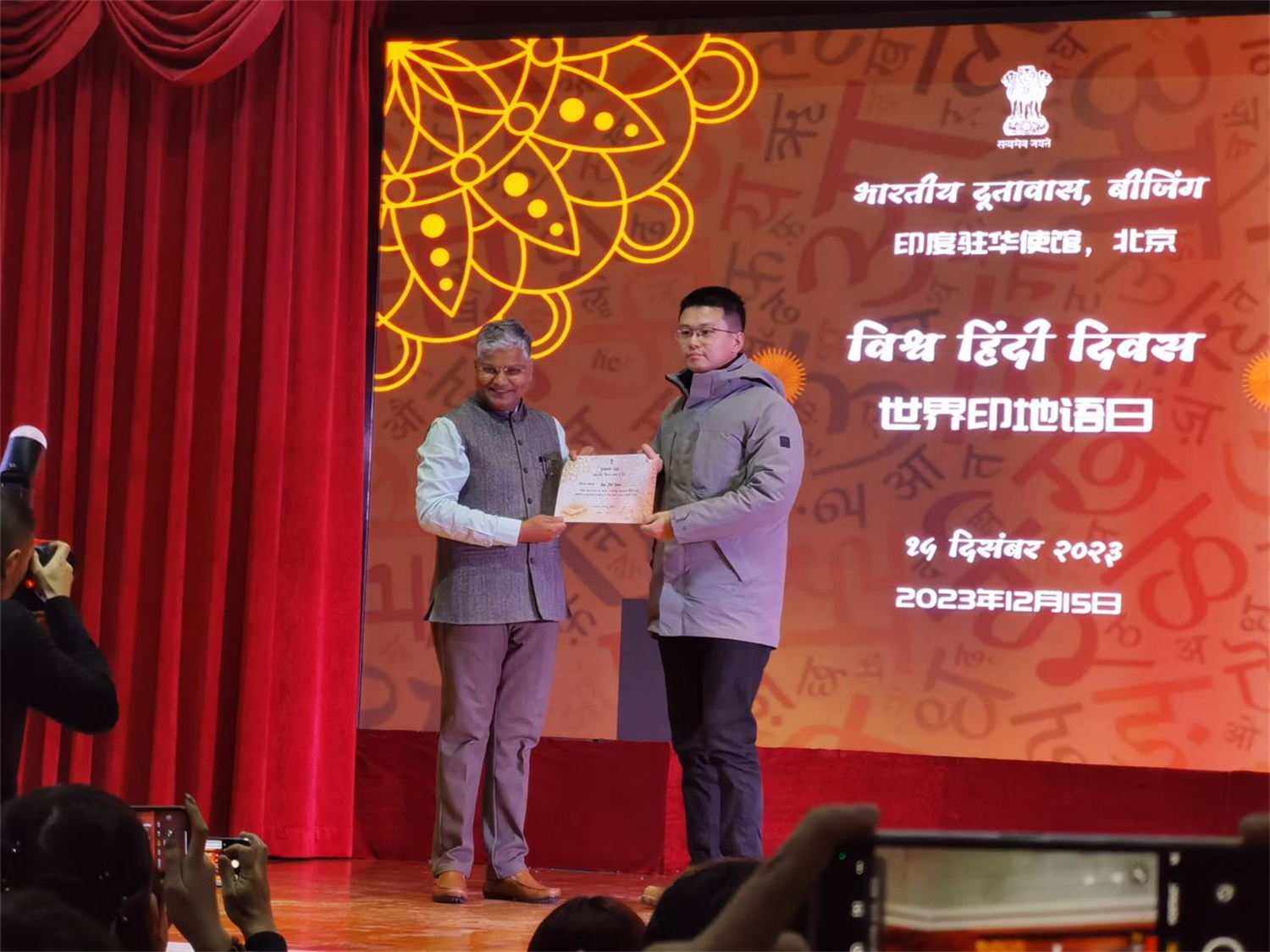 庆祝活动在印度驻华大使罗国栋(Pradeep Kumar Rawat)先生及学界前辈的致辞中拉开帷幕。庆祝活动包括“印地语诗歌朗诵比赛”和“印地语节目展演”等环节,来自北京大学、清华大学、北京外国语大学、中国传媒大学、北京第二开云体育等高校师生和中国国际广播电台国际在线印地语部记者以及在京印度留学生参加该庆祝活动。我院南亚学系印地语专业师生在活动中表现优异,取得佳绩:2021级印地语专业本科生李依诺在“印地语诗歌朗诵比赛”中获最佳表现奖,2021级和2023级印地语本科生的积极展演获得赞誉,我院印地语专业喜获“优秀组织奖”,印地语专业教师代表王靖、贾岩获“优秀指导奖”。
