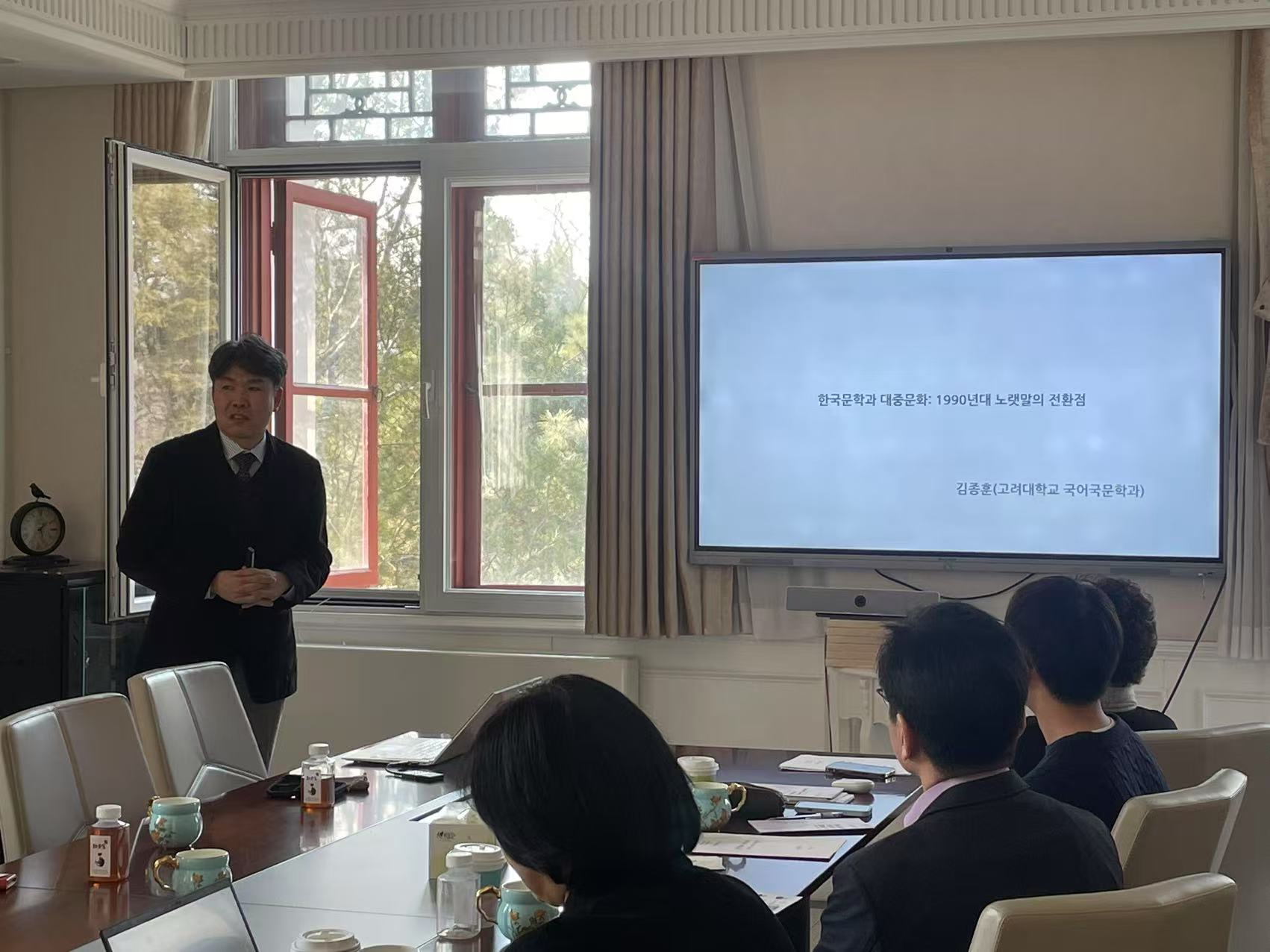 朝(韩)语系全体教师于外文楼206会议室与金钟勋教授一行进行座谈,通过座谈增进了对彼此的了解,就后续的交流与合作进行了探讨。徐晸玟老师介绍了高丽大学国际韩国语言文化研究所韩国语言文化学术传播中心自主开发的“韩国学K-MOOC线上慕课”系统,其线上课程涵盖韩国现代文学、古典文学、汉文学、韩国语教育学等多领域。