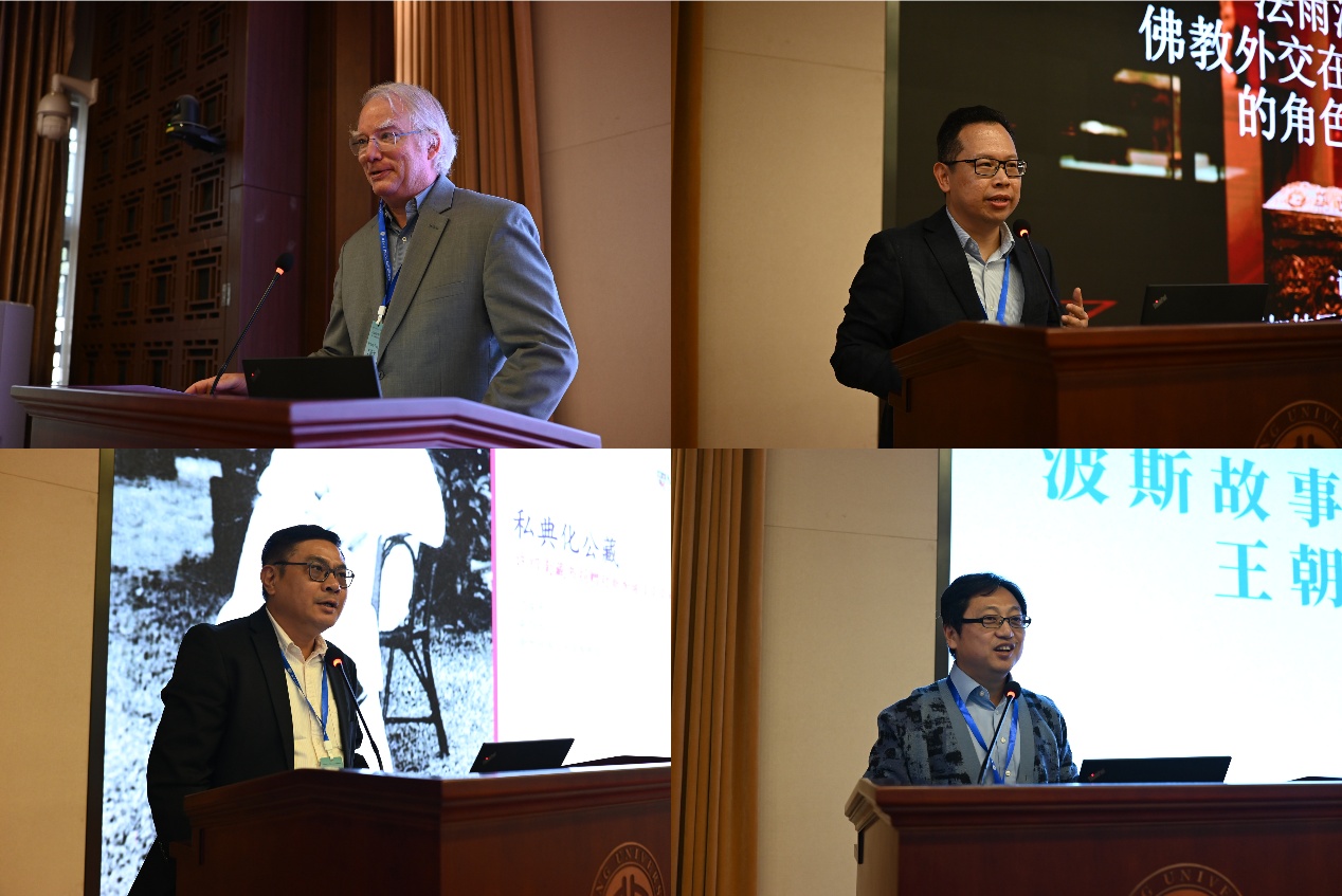 上午开幕式结束后,由王昌伟教授主持主旨发言环节。云茂潮中华文化研究中心主任、新加坡国立大学中文系丁荷生(Kenneth Dean)教授以“海洋亚洲华文文献与数字人文”为题,归纳了东南亚华人社群所保存的民间文献,并介绍了其团队在多语种文献整理与数字化平台方面的最新成果。新加坡国立大学历史学系谢明达副教授以“法雨润邻:佛教外交在中新关系中的角色与意涵”为题,通过宏船法师的访华经历以及《倒塌佛塔的秘密》艺术展等案例,揭示了佛教外交在世俗国家外交实践中的独特作用。陈明教授以“下南洋:民国时期中国佛教徒的求法与弘教”为题,梳理了民国时期中国僧人赴南亚、东南亚求法与弘教的第一手档案资料,揭示了佛教南传在中外文明交流互鉴中的历史脉络与文化内涵。新加坡国立大学图书馆沈俊平副馆长以“私典化公藏:许绍南藏书捐赠对新加坡汉学学术生态的构建”为题,回顾了许绍南整理中国学术资料的历程,并揭示了许先生所捐赠的七千余册藏书对汉学研究和中新学术交流的杰出贡献。开云体育东南亚系副系主任金勇长聘副教授以“波斯故事与泰国阿瑜陀耶王朝的政治文化”为题,探讨波斯文化对泰国宫廷文学的影响,并指出《伊朗王道故事十二则》为泰国宫廷文人佛教化后编撰的劝诫书,反映了国王与贵族势力之间的政治博弈。