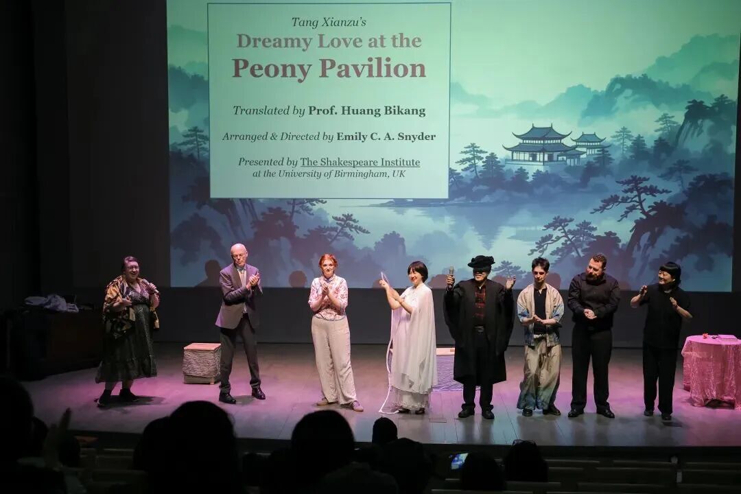 当晚,“汤显祖与莎士比亚:北京大学戏剧演出夜”在北京大学百周年纪念讲堂李莹厅开幕,中国人民对外友好协会的嘉宾和来自北大、清华、北京外国语大学、中国人民大学和北京理工大学的部分师生以及友邻优课英语教育集团的嘉宾观看了演出。钟声敲响,大幕拉开,北大燕京学堂的同学们素装登场,为观众表演了莎剧《仲夏夜之梦》的节选版。同学们精彩的表演把观众带入古城雅典郊外的树林,带入一个神奇的梦幻世界,在那里上演了一幕幕神人亲和、令人忍俊不禁的浪漫喜剧。在这想象的戏剧世界里,一对对恋人似梦非梦的爱情纠葛在仙子飞升的树林中闪现。我们听到美人鱼在海豚背上唱着美妙的歌曲,听到两对意乱情迷的恋人在啼笑皆非的情感错位中的情感表白。同学们表演得十分投入,喜剧的场景和对白在观众引起一阵阵欢笑。中场休息后,伯明翰大学莎士比亚研究所的同学们上台演出了莎剧版《牡丹亭》。伯明翰大学莎士比亚研究院院长和我院黄必康教授也在剧中分别扮演剧作家汤显祖和英国伊丽莎白时代诗人的角色。观众在台上看到的不是熟悉的水袖翻飞的杜丽娘和长袍加身的秀才柳梦梅,也听不到昆曲水磨调的雅韵,而是着装素雅的杜丽娘和现代书生柳梦梅,他们在梦境中跨越生死,用莎士比亚五音步无韵诗的流畅和音乐般跳动的节奏,演绎出生死相依的爱情,完成了一场融汇东西方文化的戏剧对话,让汤显祖的“至情”在莎士比亚的戏剧语言中重现出永恒的光辉。演出结束,剧组总监Dobson教授兴奋地对记者说,“这是我们在北大的首演,希望今后能够通过如此演出的形式,让汤显祖的戏剧突破原有受众圈层,走向更广阔的世界。”